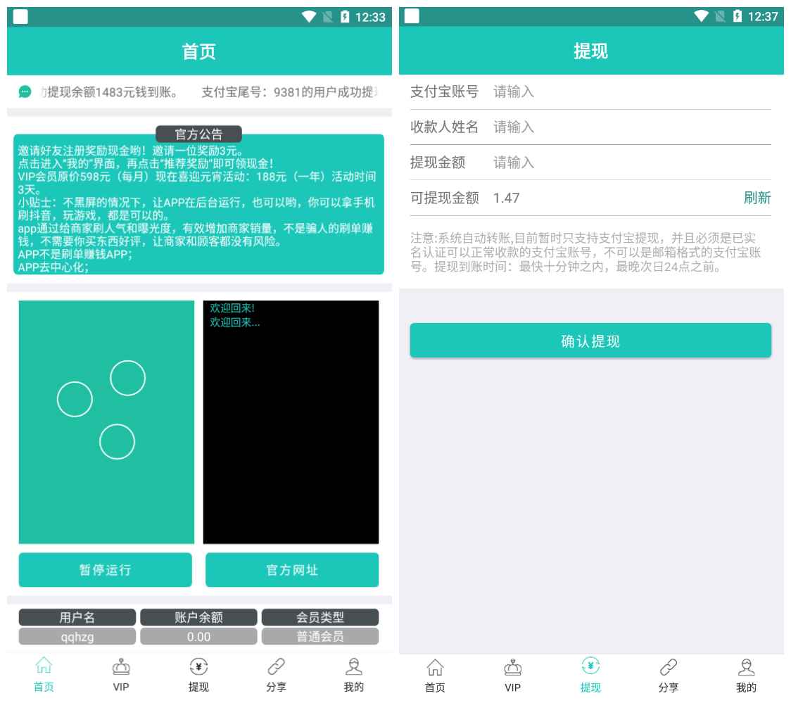 2、注册账号登录,点击首页运行,挂机到1块钱,点击底部提现,可提现0.88元