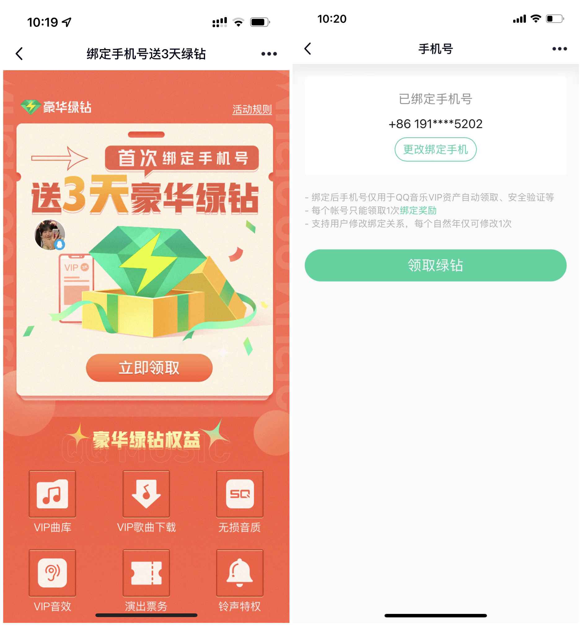 本文是新一期活动,上一期的是绑定新增7天豪华绿钻,现在缩水变成3天了;如果没绑定过的朋友可以参与一下,绑定手机号码即可领取3天豪华绿钻;每个账号只能领取1次绑定奖励,手机号码绑定60天后才可以换绑。