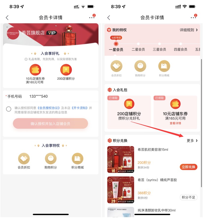显示加入店铺会员送200店铺积分再加入,然后在会员卡界面点击积分兑换“更多”